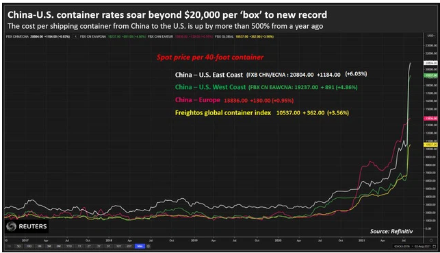 Giá mỗi container vận chuyển từ Trung Quốc tới bờ Đông nước Mỹ – một trong những tuyến đường vận chuyển container sôi động nhất thế giới – đã tăng 500% trong vòng một năm qua – tuần này đạt mức 20.804 USD, thông tin từ Công ty theo dõi vận tải, Freightos, cho biết. Mức giá đó hôm 27/7/2021 chỉ dưới 11.000 USD, tức là gấp đôi chỉ trong vòng 10 ngày.